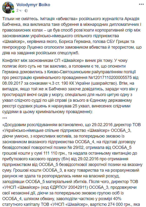 "Достать" Германа с помощью полиции его оппоненты не смогли, поскольку судьи последовательно отказывали в избрании ему меры пресечения из-за малозначительности преступления. И тогда заказ взял Департамент контрразведки СБУ. Судя по всему, речь идет о примитивно исполненной провокации, направленной на арест руководителя СП "Шмайсер" с целью отобрать у него часть уставного фонда, которой он, по мнению оппонентов, владеет противоправно", – пишет Бойко в Facebook.