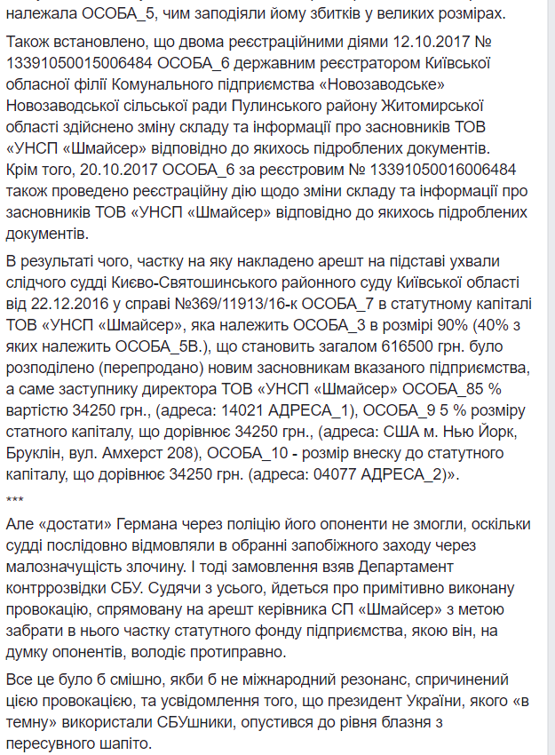 Что же касается Бориса Германа, то ему также было объявлено о подозрении в подделке документов (ч.1 ст.358 УК Украины). А в начале апреля исполнительному директору "Шмайсера" была избрана мера пресечения в виде личного обязательства.