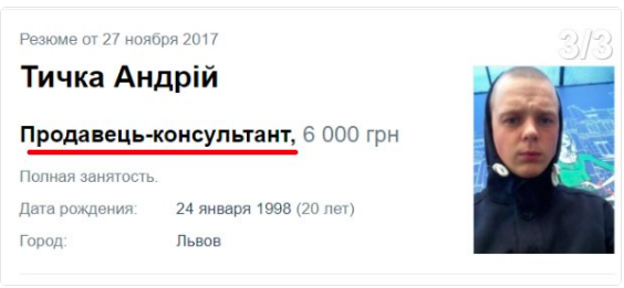 Тычка - выпускник львовского колледжа легкой промышленности, учился чинить швейные машинки, подрабатывал барменом и в торговле. На сайте по поиску работы есть его резюме, где он искал работу продавца с окладом в 6 тысяч гривен. Свою страницу в соцсети он успел удалить, то же сделали и другие налетчики.