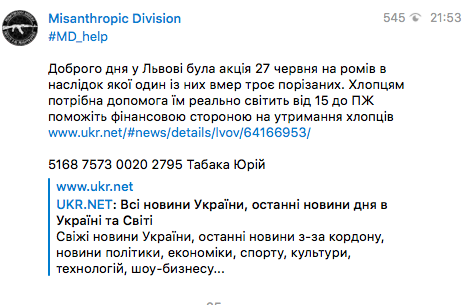 Через соцсети "побратимы" собирают деньги на помощь арестованным "за акцию на ромов", как они выражаются. Средства идут на карточку Юрия Табаки, которого считают одним из причастных к налету. Это боец "Азова", 24-летний львовский предприниматель.