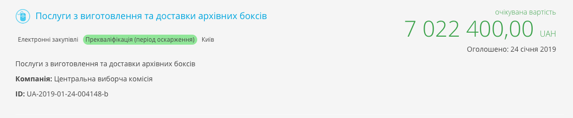 Процедуру открытых торгов по закупке специальных картонных коробок) в количестве 137076 штук (с учетом проведения 2 тура выборов) тендерный комитет Комиссии объявил еще 24 января через систему ProZorro. Истратить на закупку боксов в ЦИК планировали более 7 миллионов гривен. Таким образом, каждый бокс обходился бы в 51 гривну.