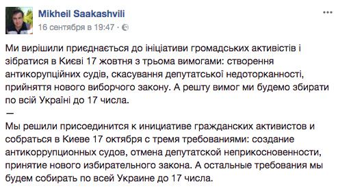 "Мы решили присоединится к инициативе гражданских активистов и собраться в Киеве 17 октября с тремя требованиями: создание антикоррупционных судов, отмена депутатской неприкосновенности, принятие нового избирательного закона. А остальные требования мы будем собирать по всей Украине до 17 числа", - анонсировал свое возвращение в Киев Михо.