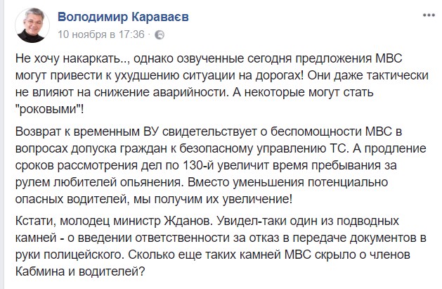 Он полагает, что предложенные меры - не охватывают весь спектр "дорожных проблем". Например, в части продления до одного года сроков рассмотрения админпротоколов по 130 ст. КУоАП (их выписывают водителям, уличенных в нетрезвой езде или отказавшихся от освидетельствования), наоборот - увеличит время пребывания за рулем любителей опьянения.