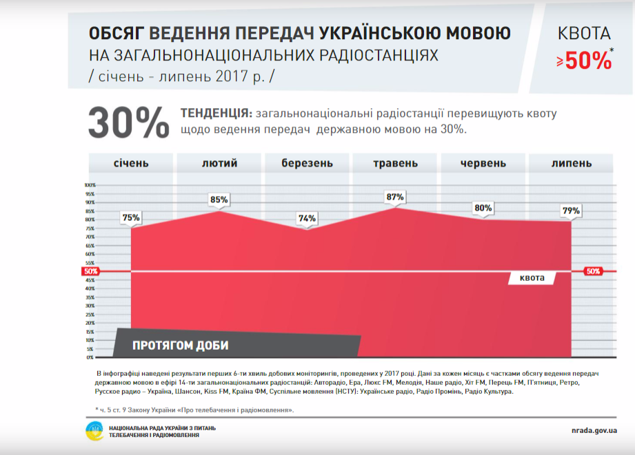 Несмотря на все трудности квотирования, перечисленные выше, статистика показывает, что радиостанции дают в эфир даже больше украинского языка, чем нужно.