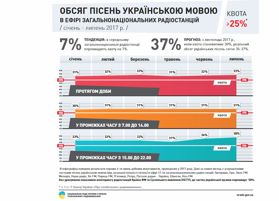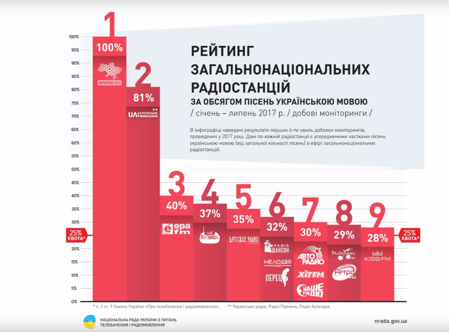 Уже год в Украине действуют квоты на украинский язык и музыку в эфире радиостанций. 8 ноября 2016 года вступил в силу закон, согласно которому на радио должны ставить в эфир 25% украиноязычной музыки и вести 50% программ на украинском языке. Песни на украинском языке должны звучать в прайм-тайм – с 7 утра до 14 дня и с 15 дня до 22-00.