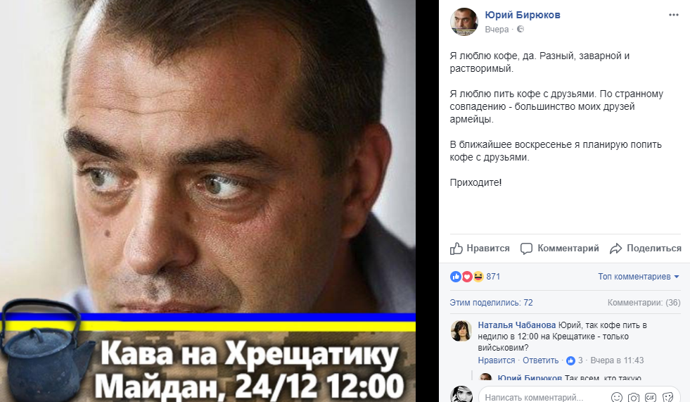 Так, например, пост в поддержку акции написал внештатный советник президента, помощник министра обороны Юрий Бирюков. Он пообещал прийти на кофе и принести печенье. И сагитировал всех присоединяться к акции.