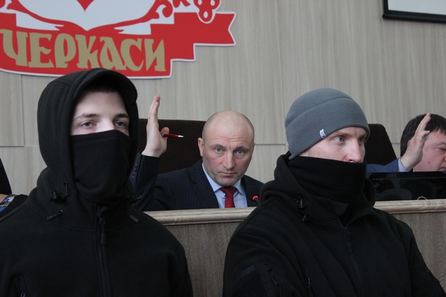 В такой гнетущей атмосфере и начали собираться на сессиию 29 января черкасские депутаты. Но едва они заняли свои места в помещении Приднепровского райсовета, как в зал вошли и встали между рядами неизвестные в камуфляже и тактической одежде.