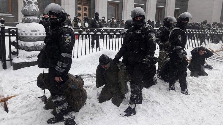 Основную же часть протестующих попросту "скрутили". Часть из них поставив на колени в снежные сугробы. Именно это фото, вкупе с ехидным комментарием министра внутренних дел Авакова (о нем ниже) и вызвало огромное возмущение.