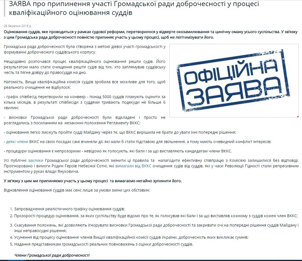 25 марта Общественный совет добропорядочности (ОСД, также известный по аббревиатуре ГРД в украинском написании – Громадянська рада доброчесності), занимающийся анализом и проверкой информации о представителях судебной ветви власти Украины, заявил о своем выходе из процесса квалификационного оценивания судей.