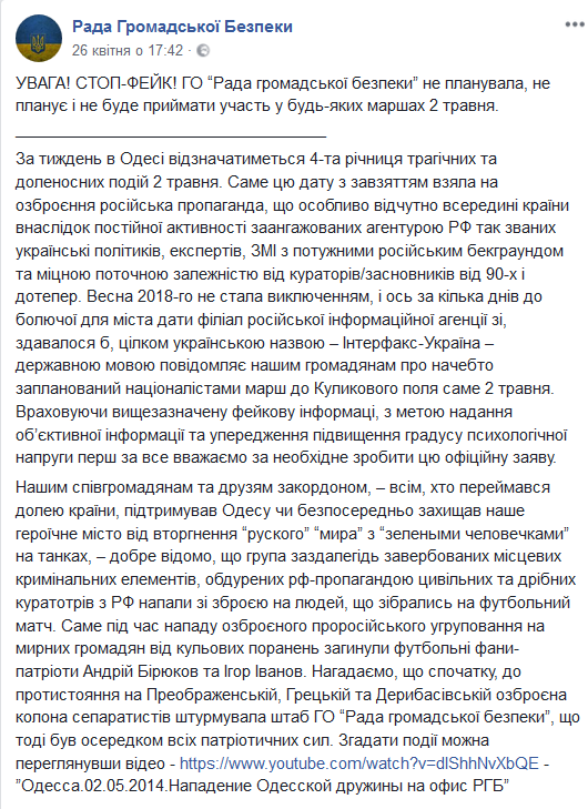 Например, бывший губернатор Одесской области в 2013-14 годах, нардеп от Оппозиционного блока Николай Скорик предполагает, что 2 мая 2018 года может произойти силовой разгон одесситов, которые придут на Куликово поле почтить память погибших в Доме Профсоюзов. В своем посте в Facebook он также утверждает, что одесские власти предвзято относятся к разным политическим силам.