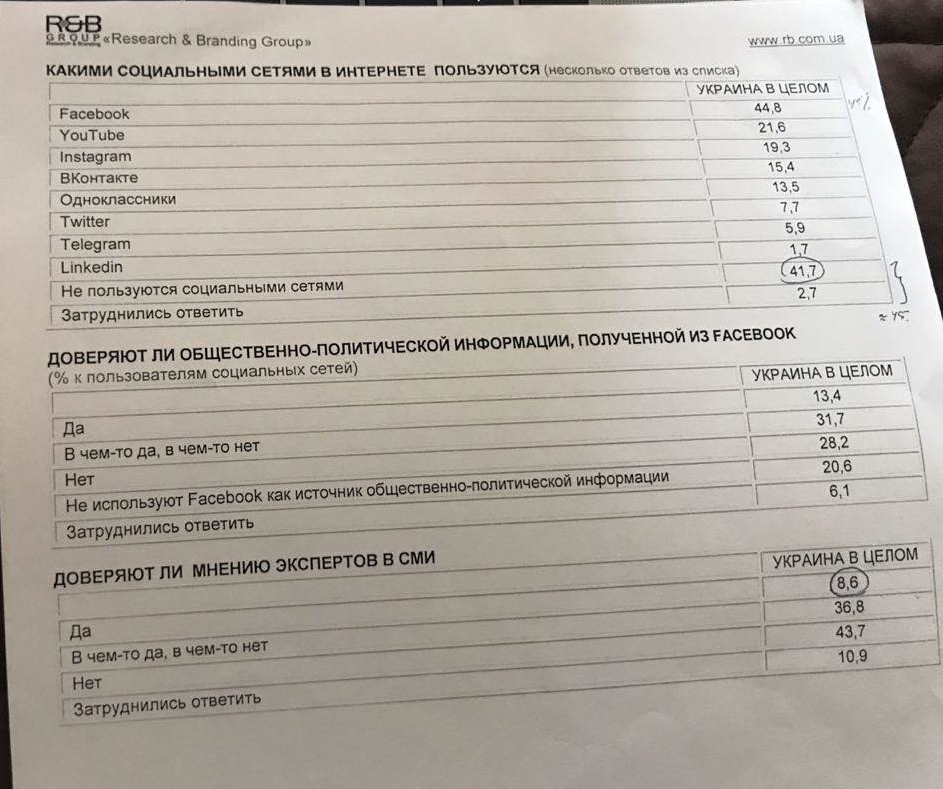По данным исследования R&B Group, проведенного по заказу Агентства кризисных коммуникаций "НЕТ", 44% украинцев пользуются Фейсбуком. По словам главы Агентства Дмитрия Раимова, информации из Фейсбука доверяют больше, чем мнению экспертов СМИ. "Хотя блогеры и эксперты, которых блокируют, пользуются только доверием тех, кто на них подписан. В целом по аудитории Facebook – им доверяют крайне мало", - добавляет Раимов.