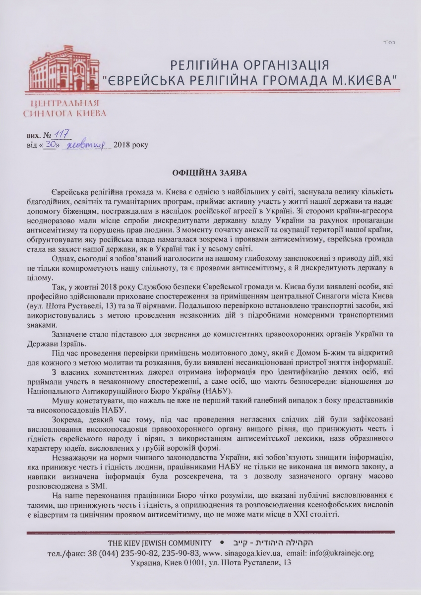 В нем говорилось, что в октябре 2018 года служба безопасности Еврейской общины Киева обнаружила лиц, которые осуществляли слежку за помещением центральной синагоги на улице Шота Руставели, а также за ее прихожанами. Раввин уточнил, что данный сигнал стал предметом дополнительной проверки, в ходе которой опасения в отношении наличия "топтунов" подтвердились.