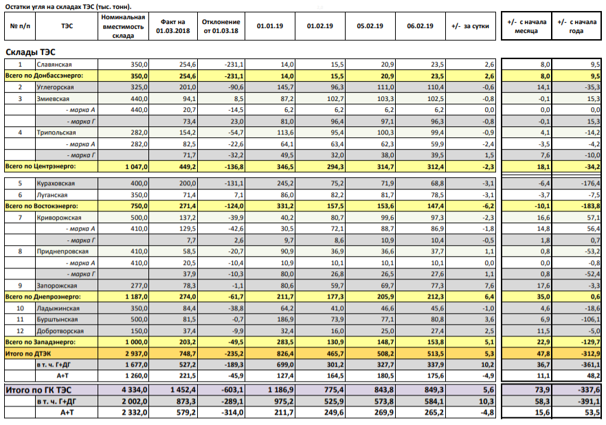 По данным Минэнергоугля, по состоянию на 4 февраля на складах предприятий было порядка 1 млн.т угля, что почти на 38% меньше, чем на аналогичную дату прошлого года. Запасы мазута ниже прошлогодних на 43,7% - всего 30,8 тыс.т. Газа в подземных хранилищах 11,1 млрд. кубов, что меньше показателей 2018 года на 10,5%.