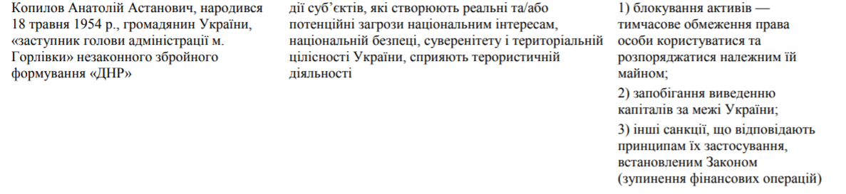 Профайл Копылова в "санкционных списках" СНБО 2016-2018 годов, источник фото: rnbo.gov.ua