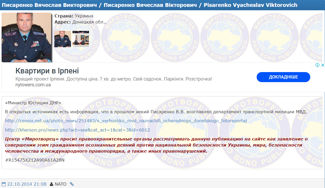 Реакция на это кадровое решение последовала мгновенно, причем из Украины. В этот же день Писаренко был внесен на скандально известный ресурс "Миротворец".
