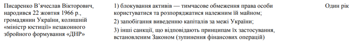 Именно так объяснялся факт внесения отставного милиционера в санкционные списки СНБО в 2016 году под №167. В аналогичных документах, визированных Порошенко в 2017 и 2018 годах, порядковый номер Писаренко - 511. Во всех этих официальных бумагах Вячеслав Викторович именуется как бывший "министр юстиции" т.н. ДНР.