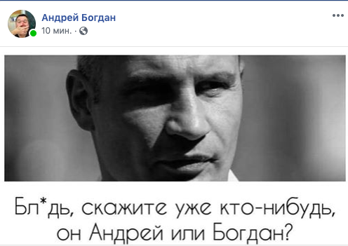 А спустя несколько часов сам Богдан, игнорируя любые просьбы журналистов прокомментировать вопрос отставки, выложил в Facebook юморной рисунок с напряженным лицом столичного мэра Виталия Кличко, якобы вопрошающего: "Бл*дь, скажите уже кто-нибудь, он Андрей или Богдан".