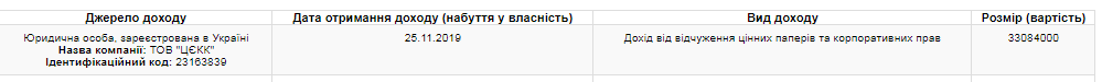 А 25 ноября Петр Порошенко получил больше 33 миллиона гривен дохода от ООО "ЦЕКК" – холдинговой компании кондитерской империи "Рошен". Доходы бывший президент получил от продажи неких ценных бумаг и корпоративных прав.