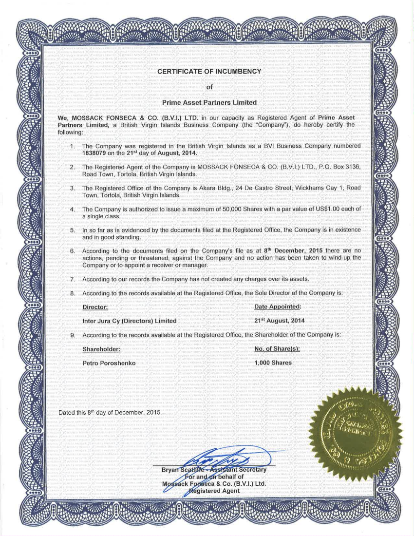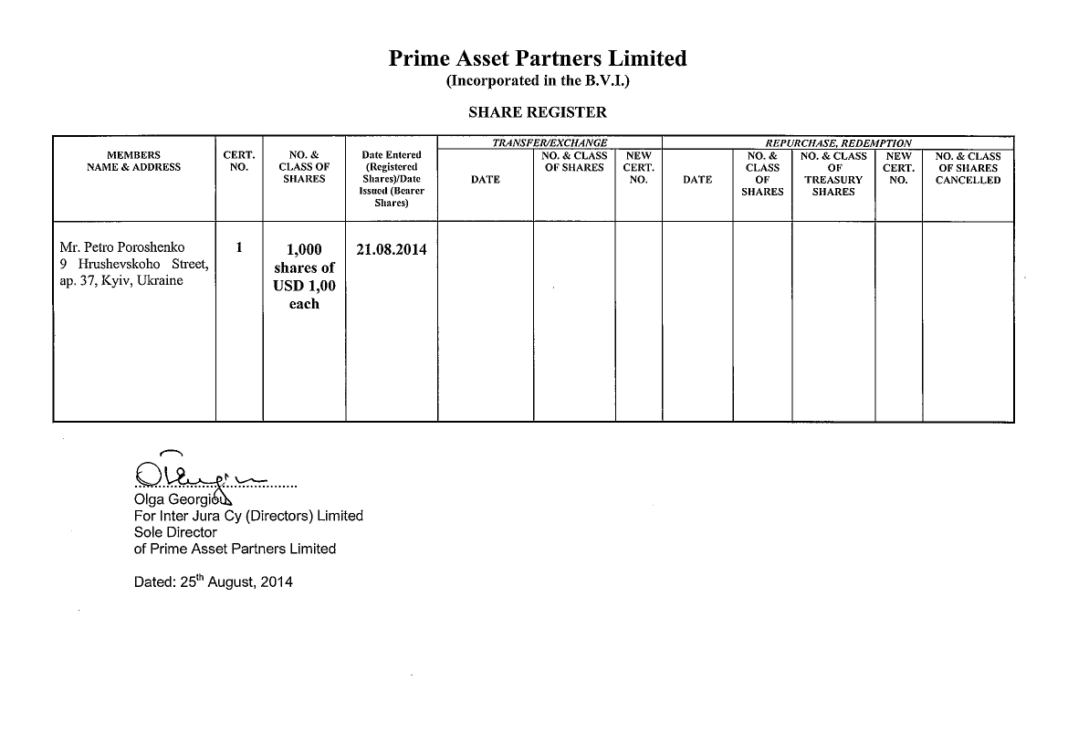 Как сообщала "Страна" в апреле 2016 года, после того, как Петр Порошенко стал президентом, он также зарегистрировал компанию в известной оффшорной зоне на Британских Виргинских островах. Фирма называлась "Prime Asset Partners Ltd" и была зарегистрирована 21 августа 2014 года.