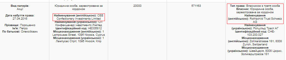 В своей декларации за 2016 год Петр Порошенко утверждал, что "Ротшильд траст" являлся собственником акций кипрской компании, что дало пиарщикам Порошенко основание говорить, что он избавился от своего бизнеса: