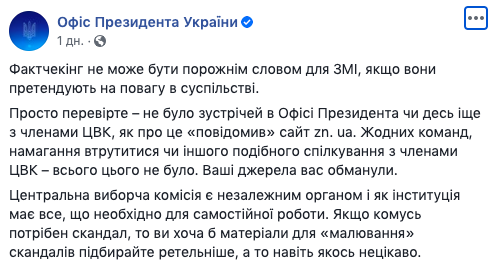 Но уже на следующей день слухи публично развеял сам глава Комиссии Олег Диденко, который в комментарии "Украинской правде" подтвердил, что действительно от "людей, приближенных к Офису президента" ему и еще четверым членам ЦИК поступали рекомендации об увольнении по собственному желанию. При этом Диденко заявил, что он лично с Ермаком по этому поводу не встречался.