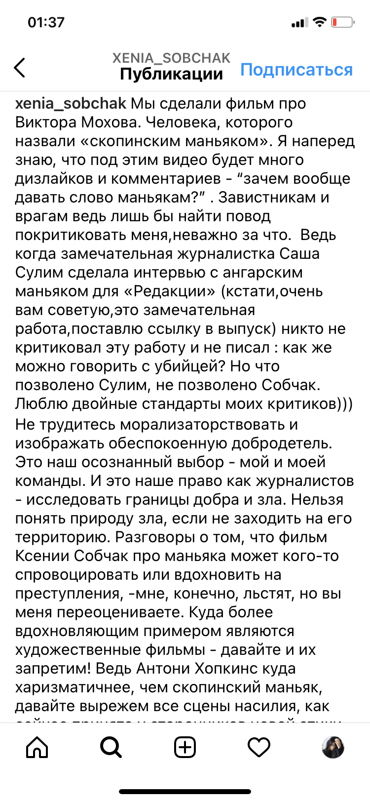 И добавила: "Разговоры о том, что фильм Ксении Собчак про маньяка может кого-то спровоцировать или вдохновить на преступления, мне, конечно, льстят, но вы меня переоцениваете. Куда более вдохновляющим примером являются художественные фильмы".