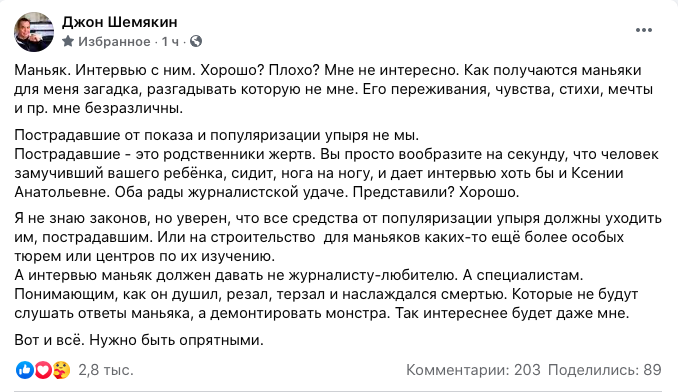 "Пострадавшие от показа и популяризации упыря не мы. Пострадавшие – это родственники жертв. Вы просто вообразите на секунду, что человек, замучивший вашего ребенка, сидит, нога на ногу, и дает интервью хоть бы и Ксении Анатольевне. Оба рады журналистской удаче. Представили? Хорошо. Я не знаю законов, но уверен, что все средства от популяризации упыря должны уходить им, пострадавшим. Или на строительство для маньяков каких-то еще более особых тюрем или центров по их изучению. А интервью маньяк должен давать не журналисту-любителю. А специалистам. Понимающим, как он душил, резал, терзал и наслаждался смертью. Которые не будут слушать ответы маньяка, а демонтировать монстра", – написал блогер Джон Шемякин.