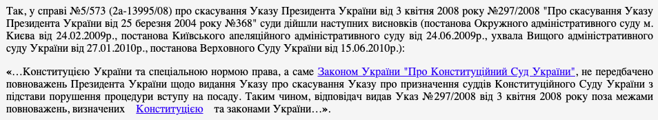 При этом Верховный суд исходил из того, что "действуя в пределах полномочий, определенных Конституцией Украины, Президент Украины реализует предоставленные ему полномочия по формированию состава Национального совета путем издания указов о назначении и освобождении ее членов. Другого способа реализации конституционных полномочий, связанных с формированием Национального совета как конституционного, коллегиального органа, в т.ч. путем отмены актов по кадровым вопросам, основным законом Украины не предусмотрено".