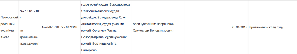 Согласно данным портала "Судебная власть", 25 апреля по делу была сформирована судебная коллегия во главе с председательствующим судьей Олегом Белоцерковцем.