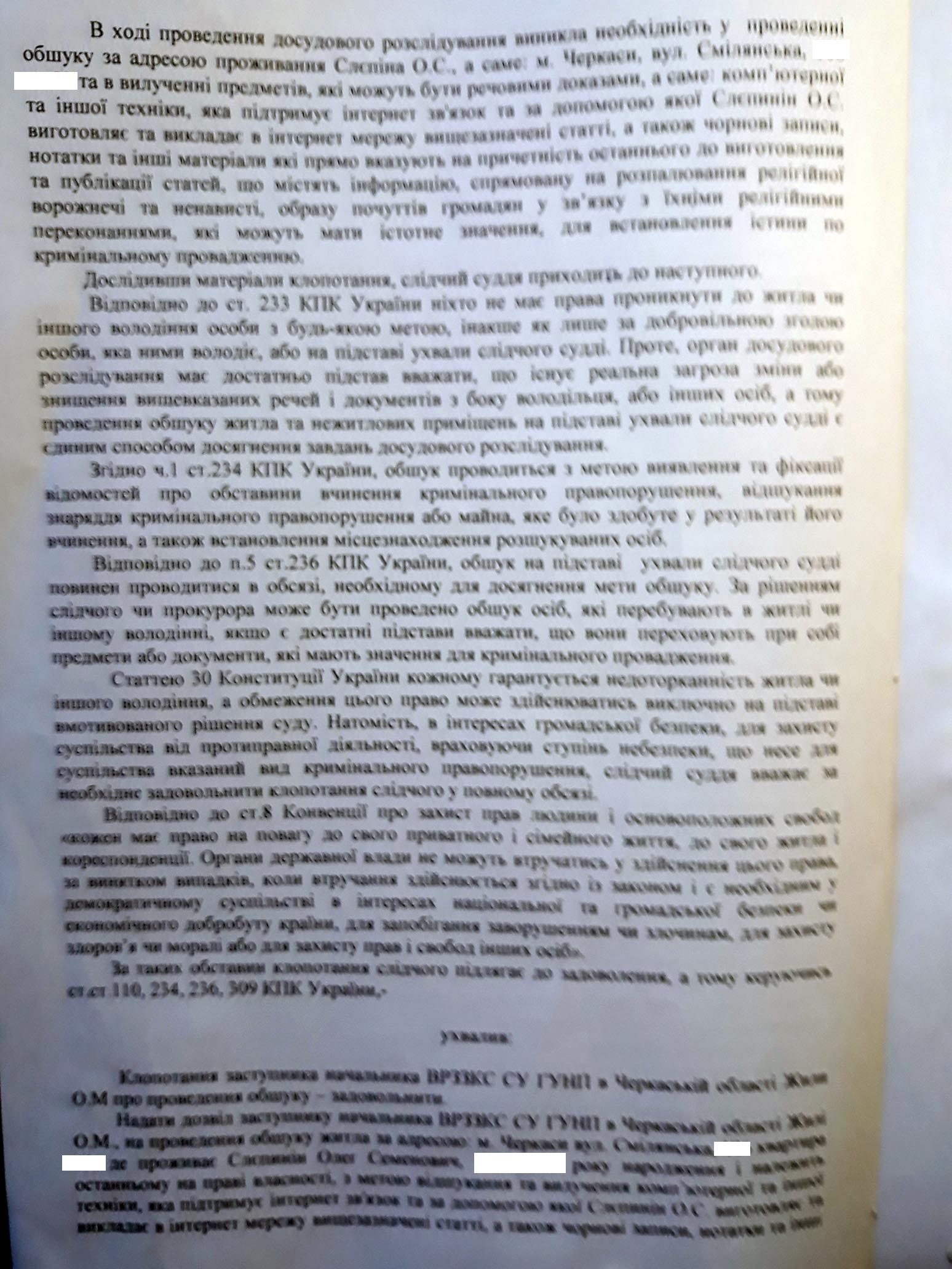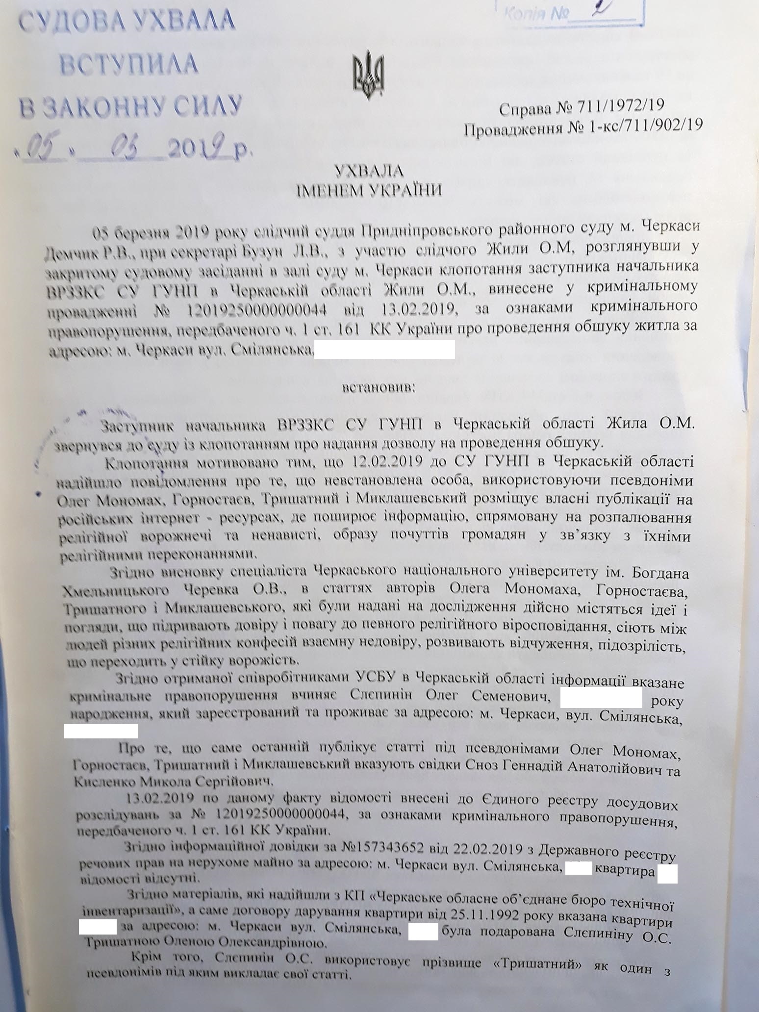 Ходатайство об обыске, поданное замотдела Следственного управлении нацполиции по Черкасской обл. Жилой А.Н. "мотивировано тем, что 12.02.19 в Следственное управление нацполиции в Черкасской обл. поступило сообщение о том, что неустановленное лицо, используя псевдонимы Олег Мономах, Горностаев, Триштатный и Миклашевский размещает собственные публикации на российских интернет-ресурсах, где распространяет информацию, направленную на разжигание религиозной вражды и ненависти".