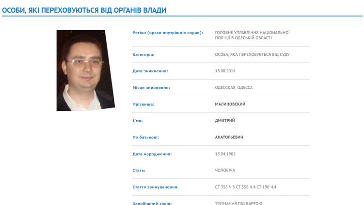 Как бы там ни было, но в конце лета 2014 года ситуация приняла новый оборот. Судя по всему, у одесских судей по делу о мошенническом отчуждении имущества стадиона СКА, попросту лопнуло терпение. Так, объясняя 18 августа отсутствие его клиента в очередном предварительном заседании адвокат Малиновского заявил суду справку о ДТП, в которое якобы угодил одессит. Правоохранители назвали этот документ очередной "липой", и Дмитрия попытались доставить в суд приводом. Впрочем, по месту жительства оперативник не нашел Дмитрия. Малиновского объявили в розыск, а по мотивам распутывания следов "телефонных террористов", срывавших работу суда, следствие пыталось выйти на его след.
