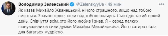 "Как говорил Михаил Жванецкий, ничего страшного, если над тобой смеются. Гораздо хуже, когда над тобой плачут. Сегодня такой горький день. Сочувствие всем, кто его любил и знал. Я - среди пылких поклонников силы мысли Михаила Михайловича. Его сатира стала для многих мудростью", - написал президент в Twitter-аккаунте.
