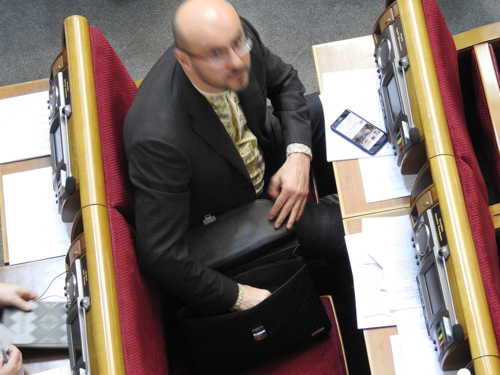 Сергей Рудык, народный депутат от БПП, который очень любит носить золотые часы под вышиванку, ходит в парламент с кожаным портфелем Baldinini.