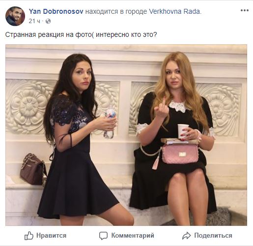 Как оказалось, парламентский фотограф Ян Доброносов сфотографировал Егорову вместе с подругой в кулуарах парламента. Экс-помощница радикала среагировала на щелчок затвора фотоаппарата и показала средний палец.