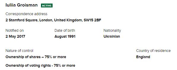 Действительно, ранее сообщали о том, что Юлия Гройсман в мае 2017 года зарегистрировала в Лондоне собственную компанию под названием 2100 consultancy ltd с уставным капиталом в размере 1 фунт стерлингов. Дочь Гройсмана в 25 лет стала директором и единственным владельцем этой фирмы.