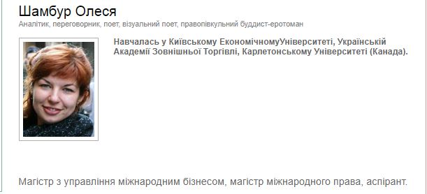 А еще "Страна" нашла профиль супруги Геращенко на литературном сайте "Буквоїд". Там указано, что Олеся Шамбур - аналитик, переговорщик, поэт, визуальный поэт и правополушарный буддист-эротоман. А также представлены ее стихи.