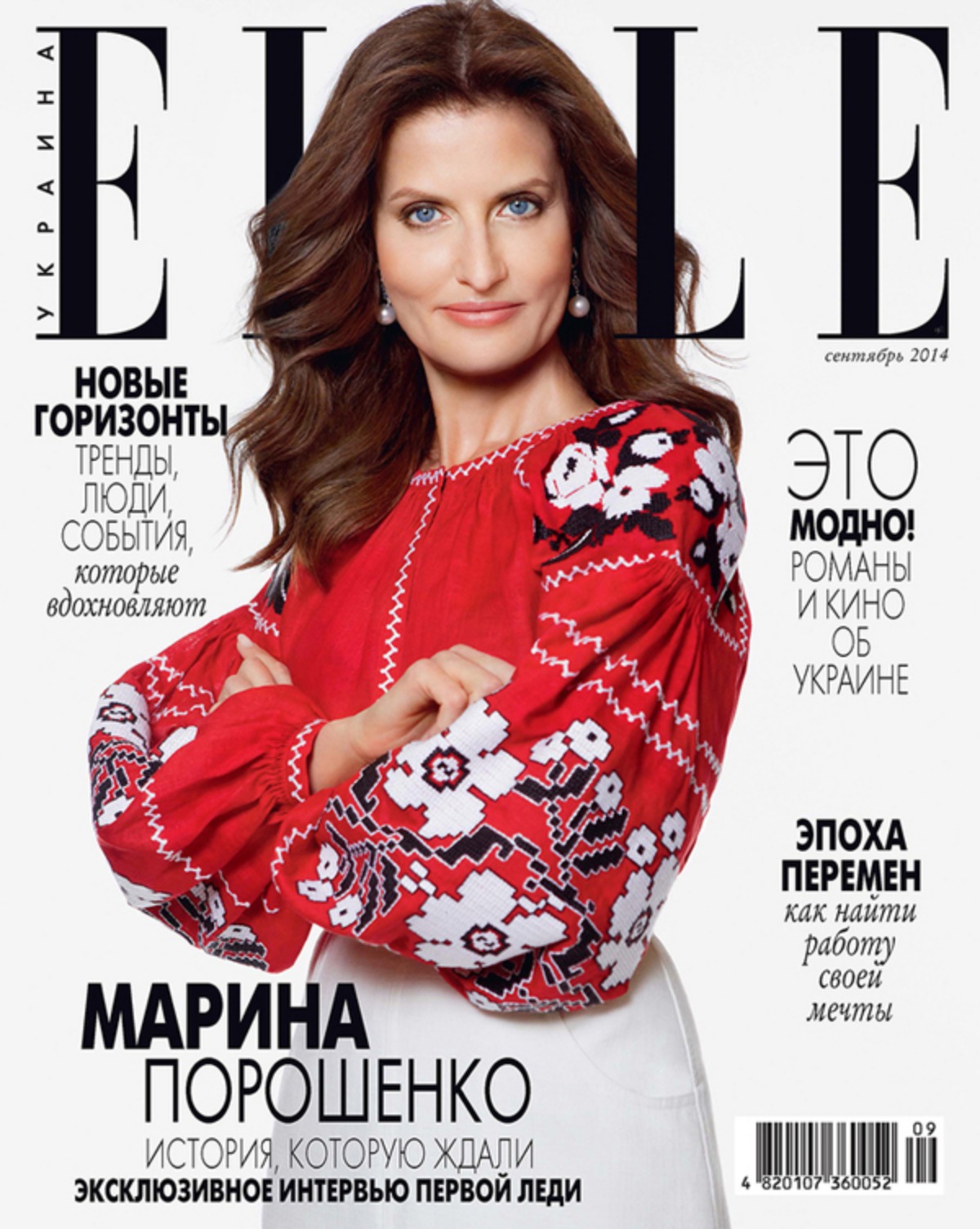 Жена Петра Порошенко появилась в вышиванке на обложке глянца Elle, а также очень часто надевала сорочки во время визитов за границу, фото: elle.ua