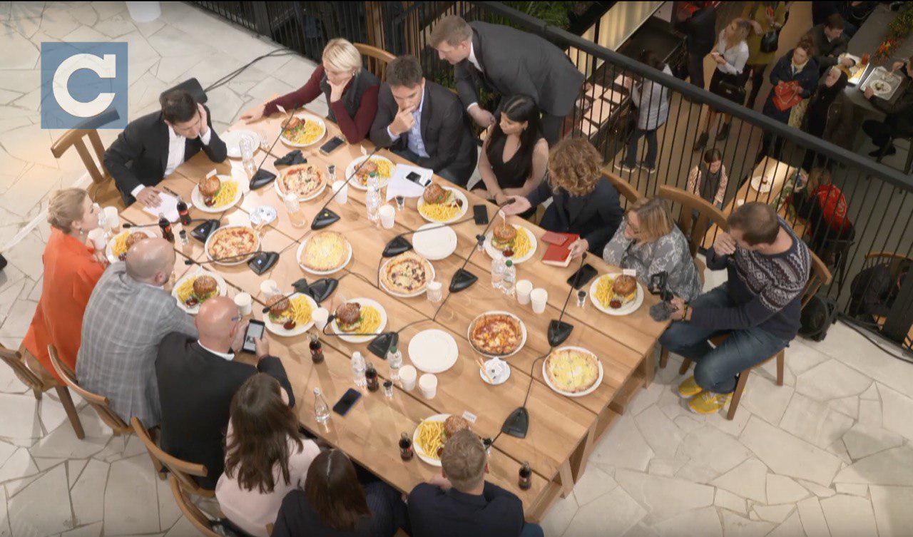 Группам, которые задавали вопросы во время обеда подали бургеры с картошкой фри и пиццу прямо за стол с Зеленским.