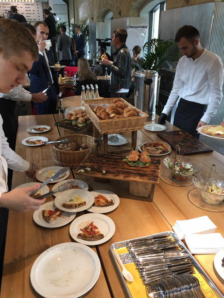 Конечно же, в месте, где повсюду еда - для журналистов приготовили угощения. А точнее накрыли два шведских стола: бутерброды, мини-бургеры, круассаны, чизкейк, канапе и различные напитки. Блюда все время обновляли и приносили новую еду.