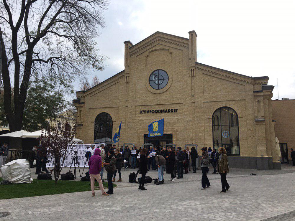 В это же время под зданием Kyiv Food Market пришли активисты "Свободы". Несколько десятков человек с флагами и плакатами стоят на площадке перед фуд-холлом.