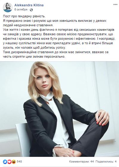 Интересно, что еще 6 октября Александра Клитина написала у себя на странице пост о своей красоте и сексизме. В нем она пишет, что считает своей миссией продемонстрировать - как красивая женщина может быть эффективной в работе.