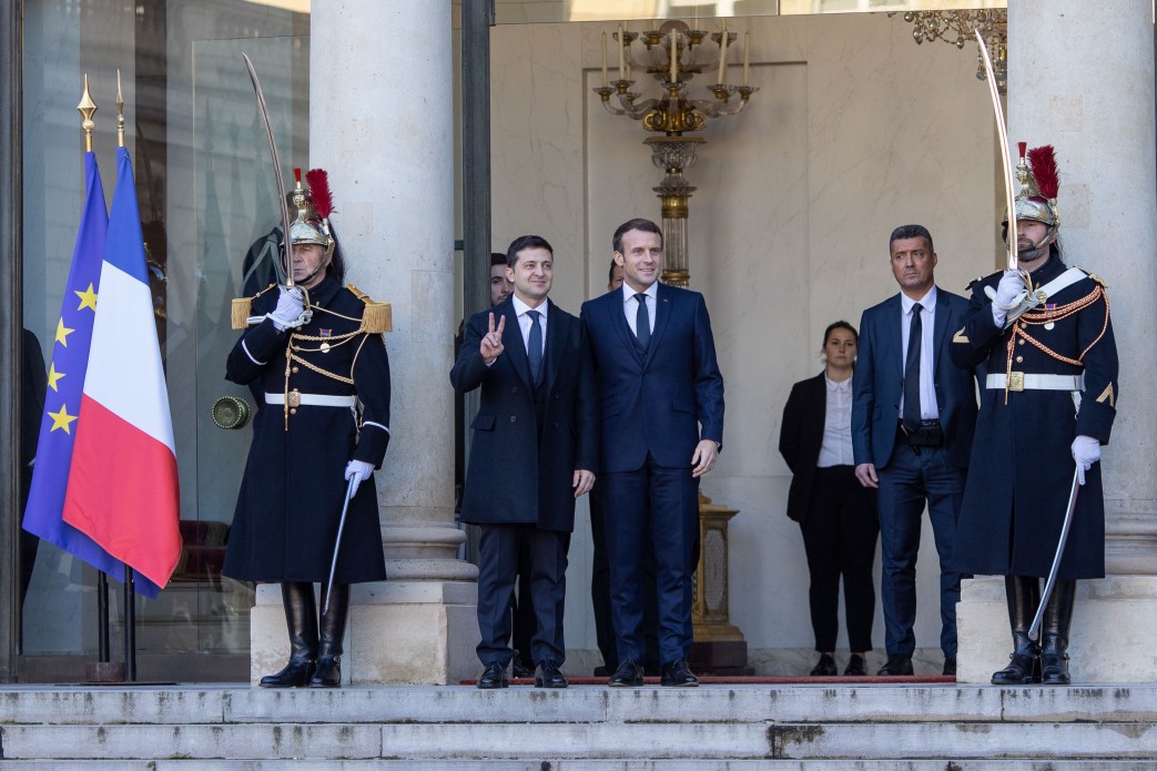 Президент Зеленский прибыл в Елисейский дворец на минивэне Renault Espace, его высадили далековато от ступенек, где его ждал Макрон.