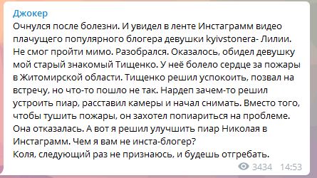 "Очнулся после болезни. И увидел в ленте Инстаграмм видео плачущего популярного блогера девушки kyivstonera- Лилии. Не смог пройти мимо. Разобрался. Оказалось, обидел девушку мой старый знакомый Тищенко. У неё болело сердце за пожары в Житомирской области. Тищенко решил успокоить, позвал на встречу, но что-то пошло не так. Нардеп зачем-то решил устроить пиар, расставил камеры и начал снимать. Вместо того, чтобы тушить пожары, он захотел попиариться на проблеме. Она отказалась. А вот я решил улучшить пиар Николая в Инстаграмм. Чем я вам не инста-блогер? Коля, следующий раз не признаюсь, и будешь отгребать", - написал пранкер.
