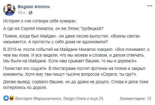 "История о "не сотвори себе кумира". А где же Сергей Михалок, он же Ляпис Трубецкой? Помню, когда был Майдан - он даже песню выпустил. "Воины света" называется. А протесты у себя дома не вдохновили? В 2015-м, после событий на Майдане Михалок говорил: "Все понимают, о чем мы поем. И все видели, что мы можем и словом, и делом отвечать. Мы были на Майдане. Если нам срывает башню, то мы и деремся". Полистал его соцсети. В Инстаграме постит фоточки на пляже и закрыл комменты. Хотя ему там пишут тысячи вопросов "Серега, ты где?". Делаю вывод: сорвало башню, но до драки не дошло. Слова и дела тоже потерялись по дороге", - высказывается украинский журналист Богдан Аминов.