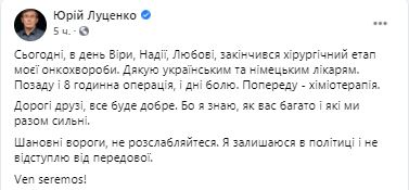 "Сегодня, в день Веры, Надежды, Любви, закончился хирургический этап моего онкозаболевания. Спасибо украинским и немецким врачам. Позади и 8-часовая операция, и дни боли. Впереди - химиотерапия", - написал Юрий на своей странице в социальной сети Фейсбуке.