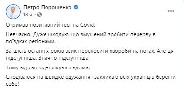 "Получил положительный тест на Covid. Не вовремя. Очень жалею, что вынужден сделать перерыв в поездках по регионам. За шесть последних лет я привык переносить болезни на ногах. Но эта коварная. Поэтому с сегодняшнего дня лечусь дома. Надеюсь на скорейшее выздоровление и призываю всех украинцев беречь себя", - написал политик.