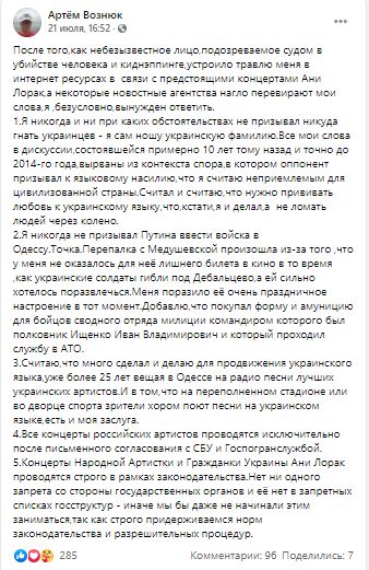 Ответ от Артема Вознюка не оставил себя ждать, и он высказал свою позицию на своей странице в Facebook.