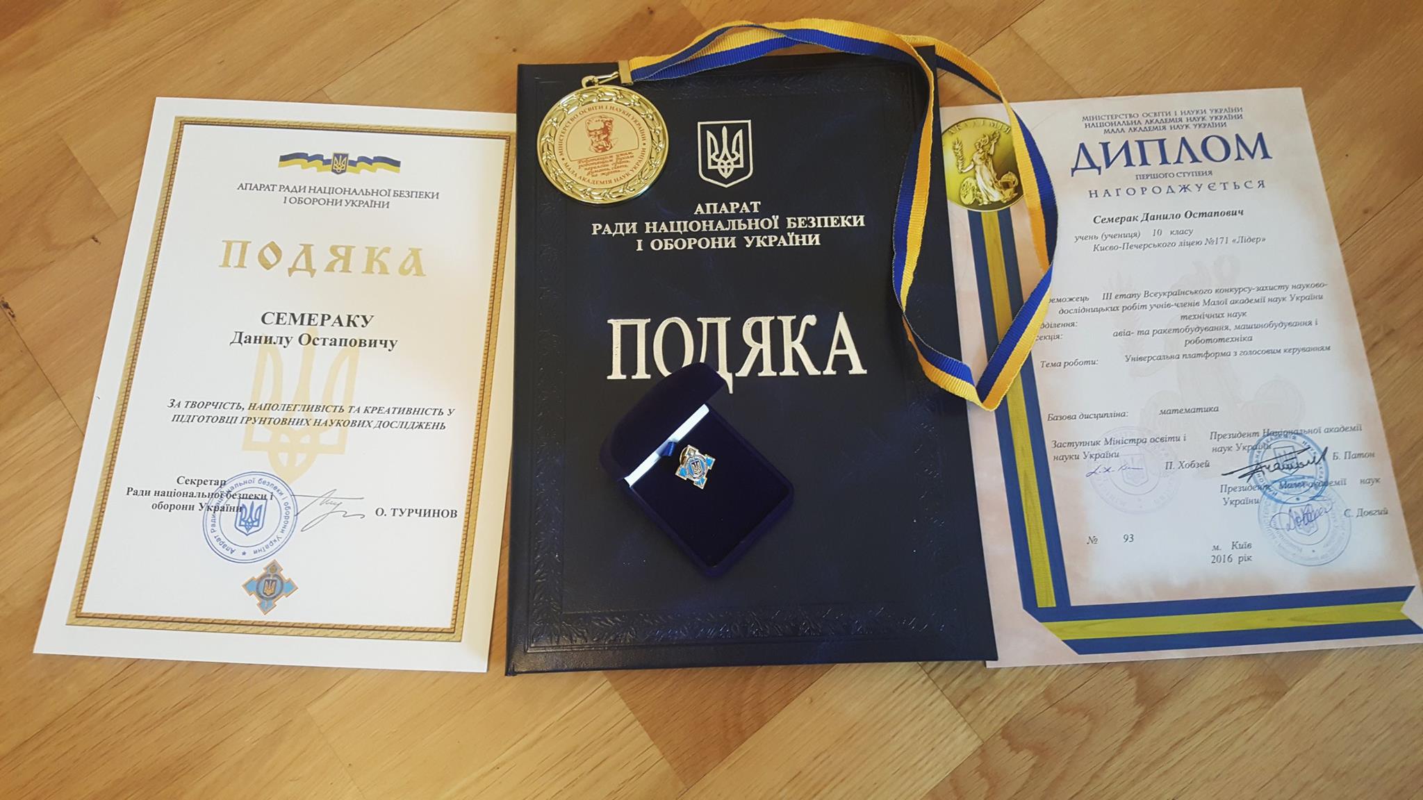 На интернет-портале лицея значится, что Данил Семерак занял первое место в секции "Авиа- и ракетное строительство, машиностроение и робототехника" на III этапе Всеукраинского конкурса-защиты научных работ Малой Академии Наук. Сам же парень на своей страничке в соцсети хвастается грамотой от секретаря СНБО Александра Турчинова "за креативность в подготовке основательных научных исследований".