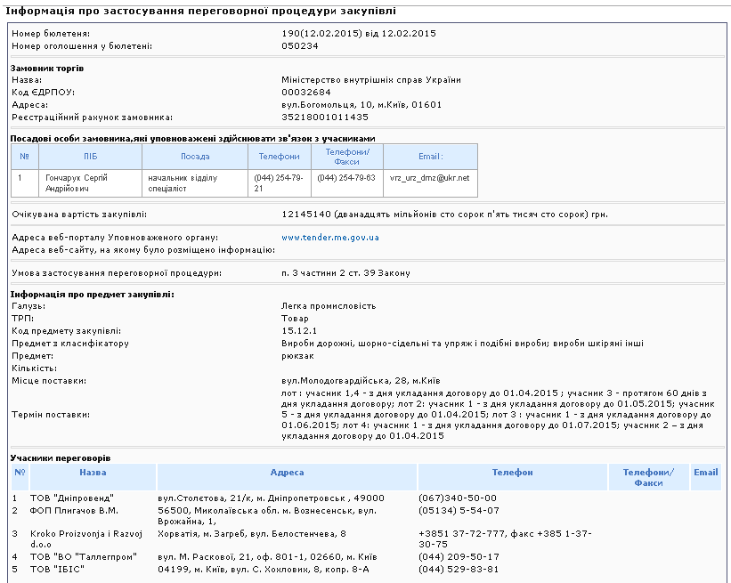 Скандальная закупка была проведена в феврале 2015 года без тендера, по процедуре переговоров. МВД тогда поначалу хотело закупить рюкзаков на 12,1 млн грн., а переговоры велись сразу с пятью претендентами. Об этом сообщалось в объявлении в "Вестнике госзакупок":
