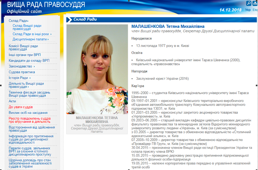 Как выяснила "Страна", одну из ключевых позиций в высшем органе судебной власти занимает бывший юрист структур Петра Порошенко Татьяна Малашенкова. Она руководит одной из трех дисциплинарных палат ВСП, которая может "казнить и миловать" проштрафившихся судей.